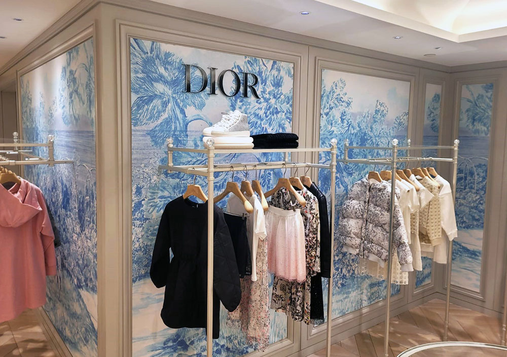 At Harrods, the scheme was further enhanced with bespoke wallpaper and integrated Dior branding, layering the space with texture and reinforcing the identity of the environment.