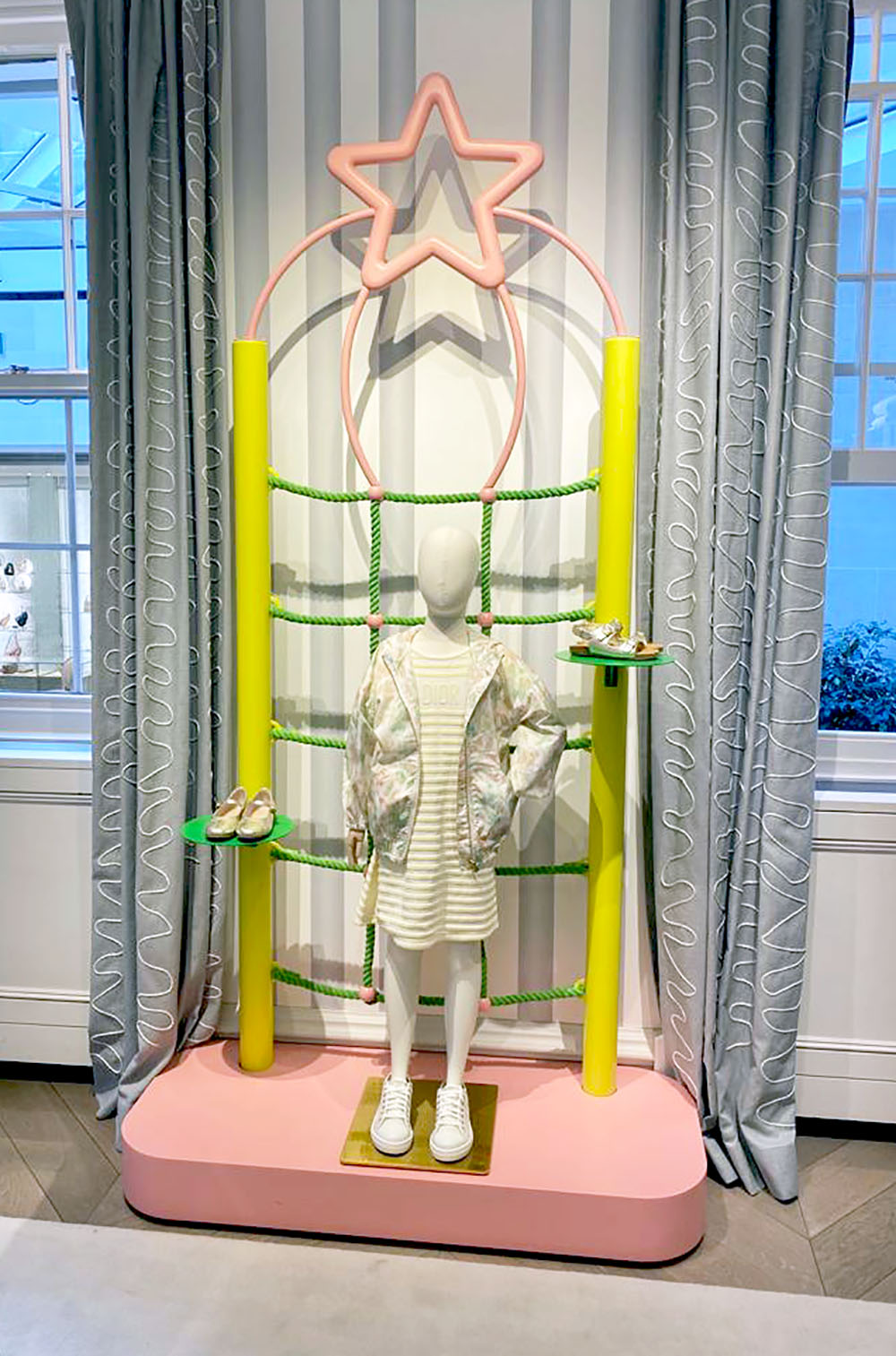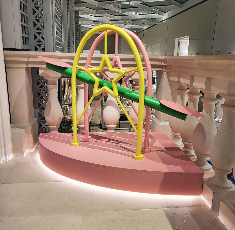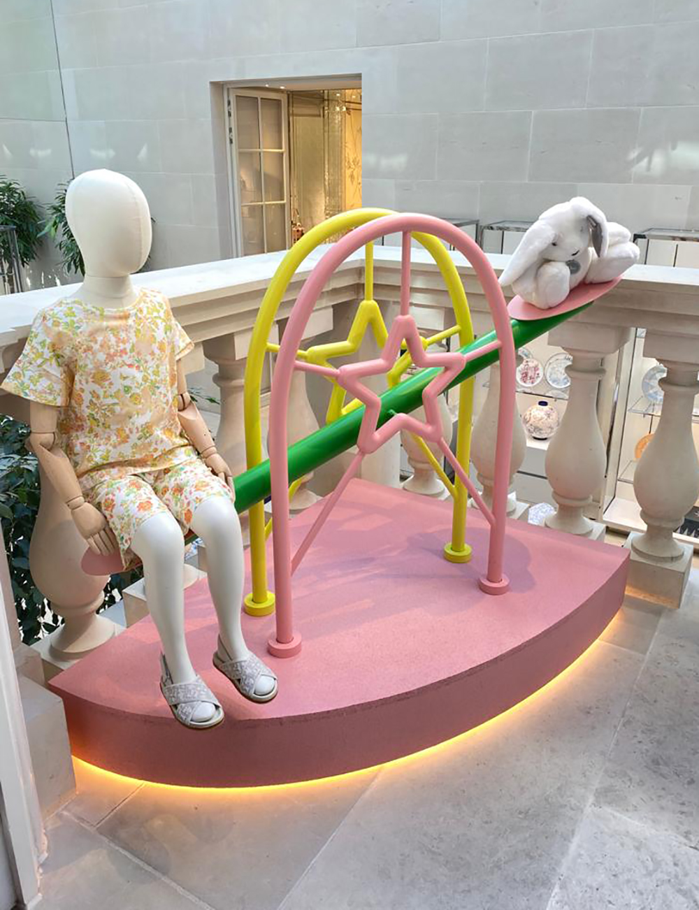 Designed to create a striking contrast between refined fashion and playful form, the displays featured bespoke metalwork structures including slides and climbing frames, all precision manufactured and powder coated in soft, vibrant tones. Illuminated plinths added a subtle glow, elevating the installations and drawing focus to the product.