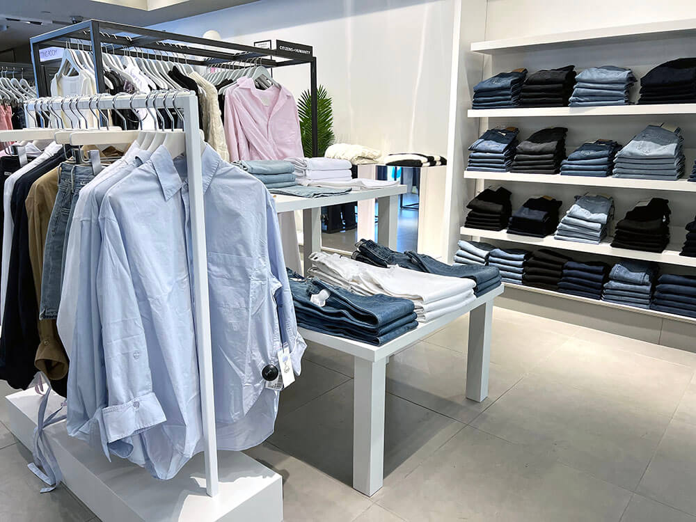 The space featured bespoke display tables and garment rails, all designed to present the collection with clarity and consistency. Lightboxes and pillar cladding were integrated throughout, reinforcing the brand identity and adding depth to the environment.