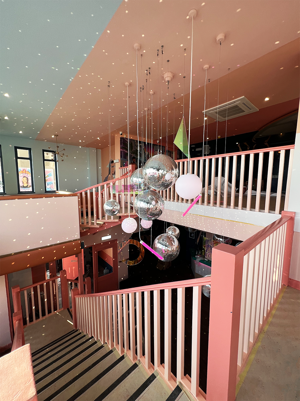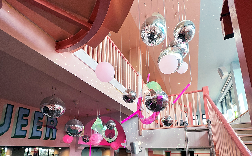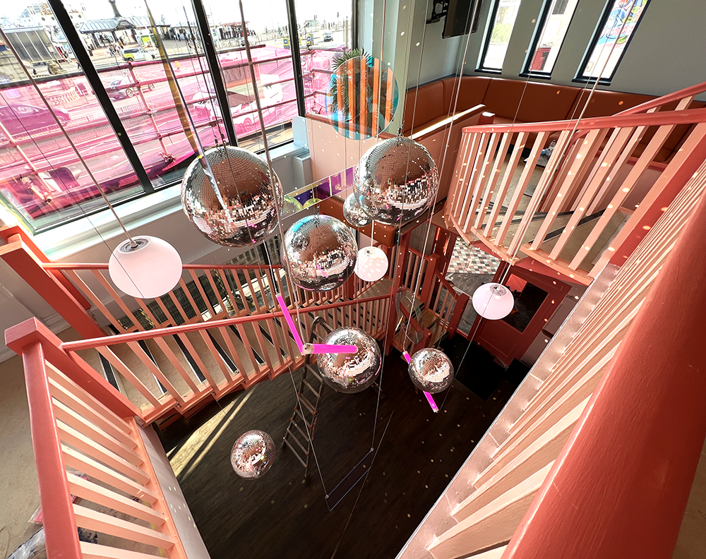 Working within the newly renovated space in Kemp Town, the concept centred around creating a playful yet welcoming LGBTQ+ venue, balancing statement visuals with an inclusive, comfortable atmosphere. Suspended installations of disco balls formed a shimmering centrepiece, catching and reflecting light throughout the stairwell to create movement and depth.