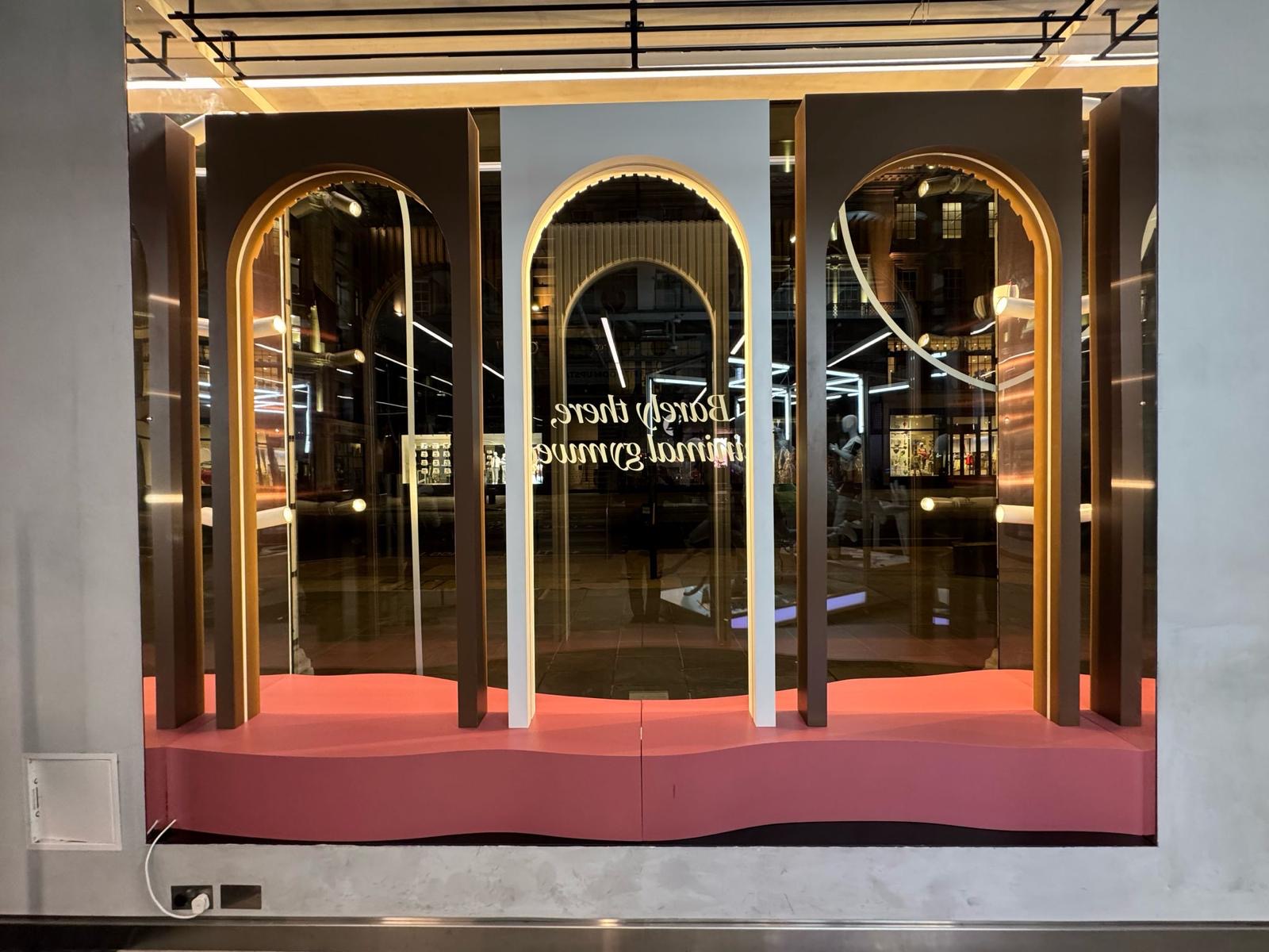 Fluid, organic forms framed the mannequins, translating the collection’s contouring aesthetic into three-dimensional architecture. Curved apertures, layered silhouettes and a confident pink palette created depth and movement, softening the storefront while maintaining strong visual impact.