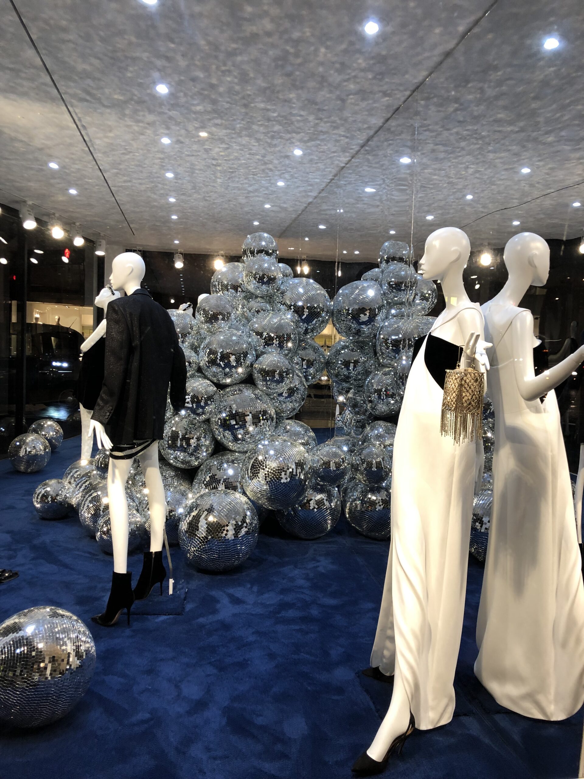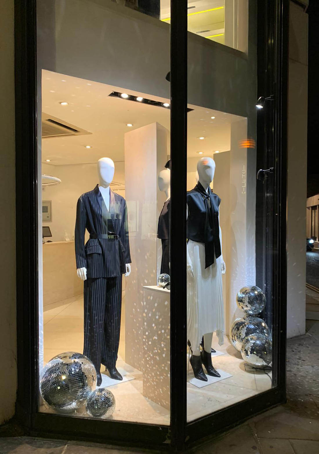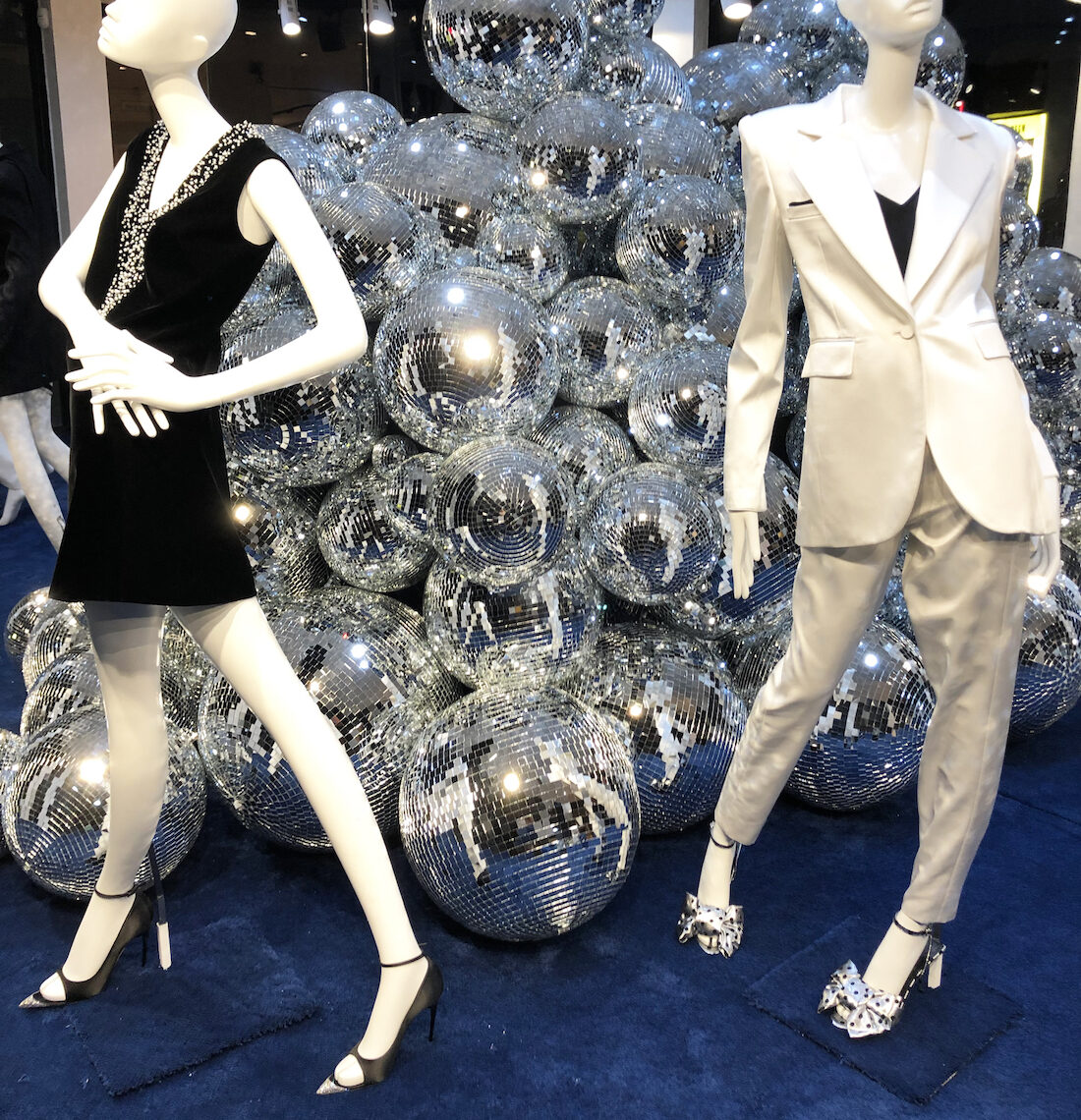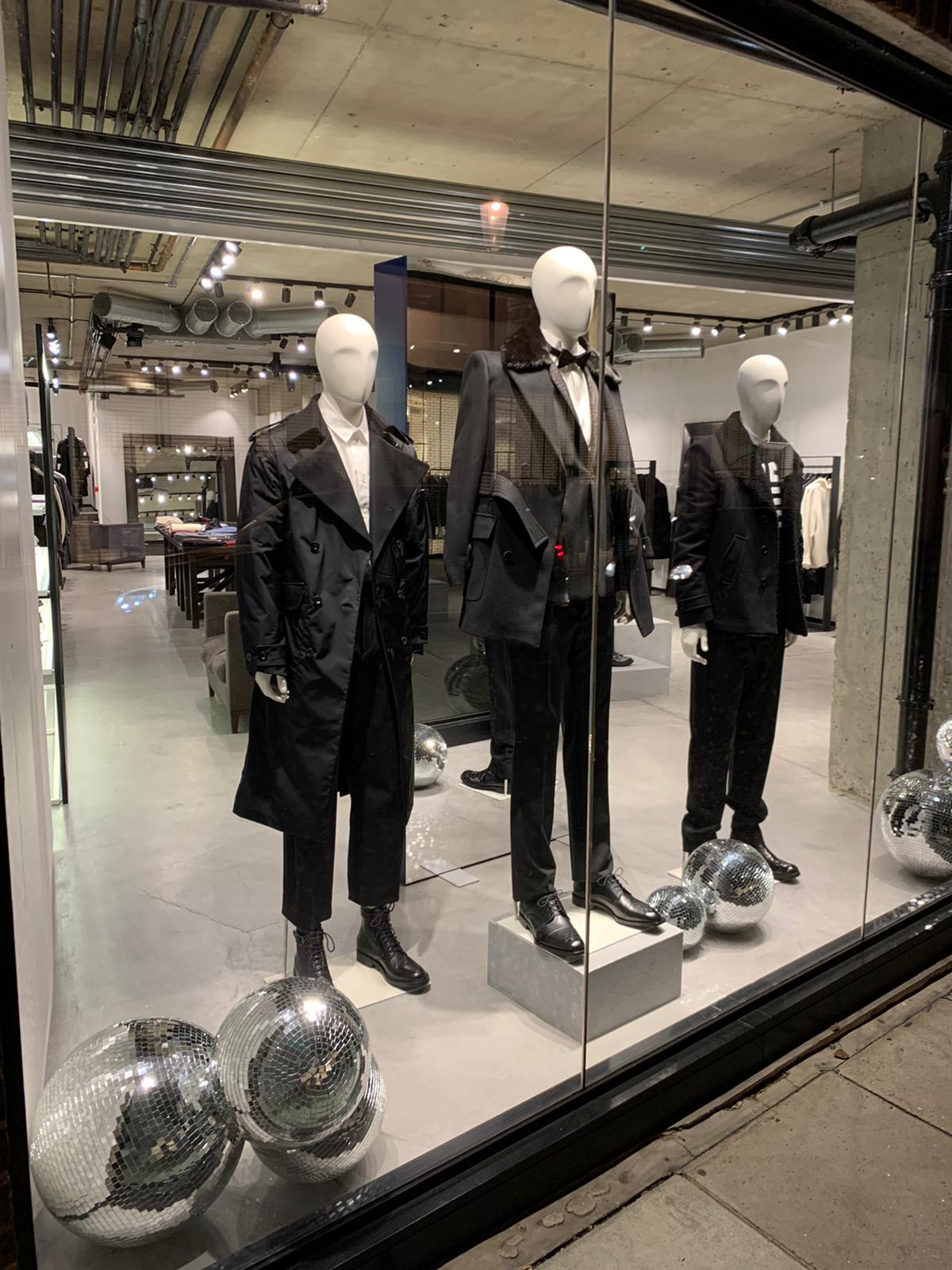 At the flagship, the window was transformed into a shimmering focal point, centred around a dramatic cascade of disco balls set against a rich blue carpet. Backed by mirrored walls, the installation amplified light and reflection, creating depth and a sense of movement that drew attention from the street. Inside the store, clusters of mirror balls were positioned throughout the space, extending the visual language and enhancing the immersive feel.
