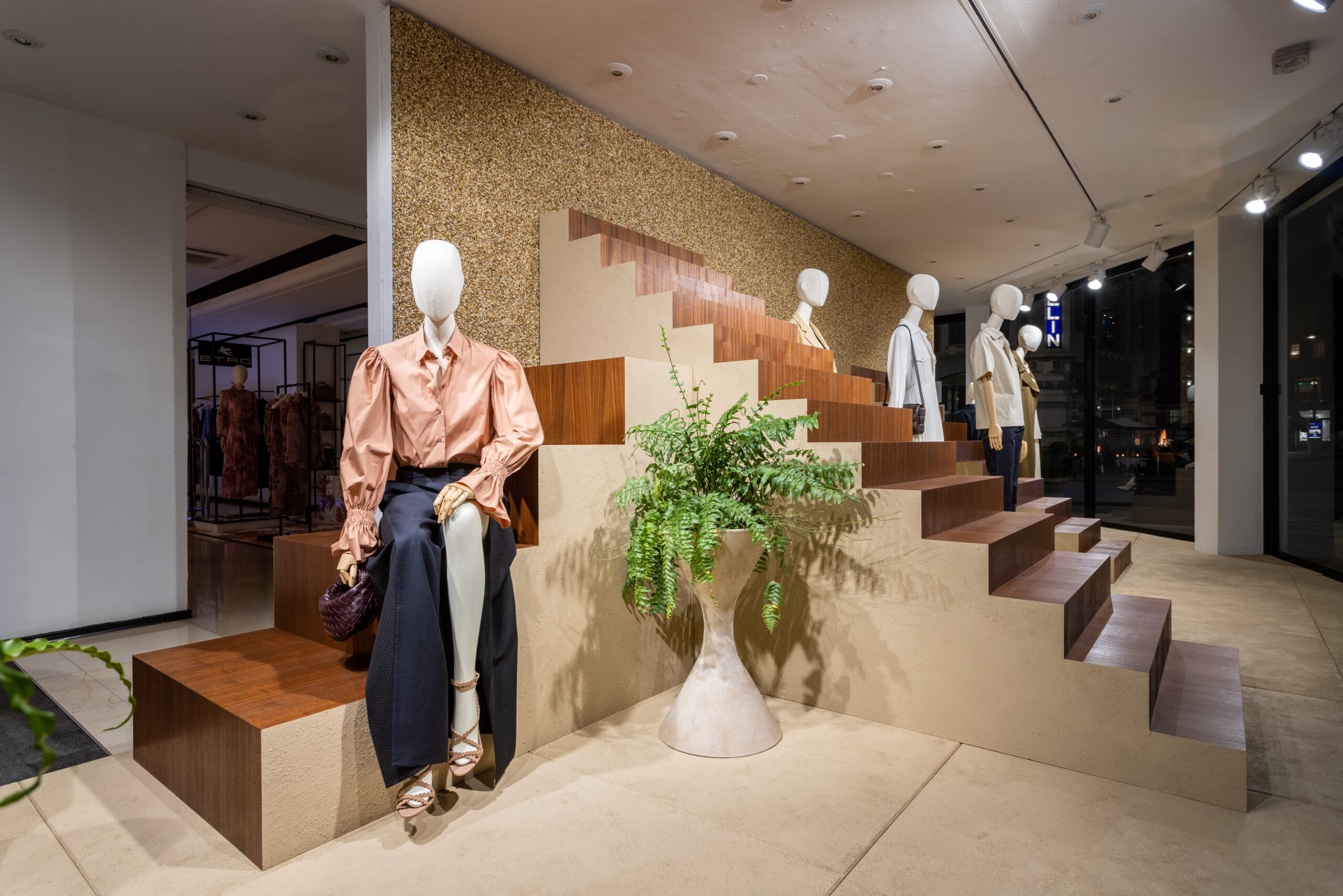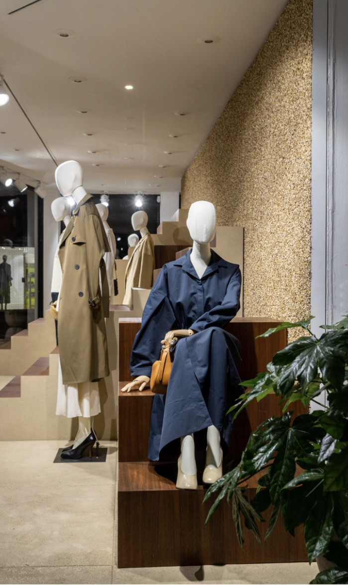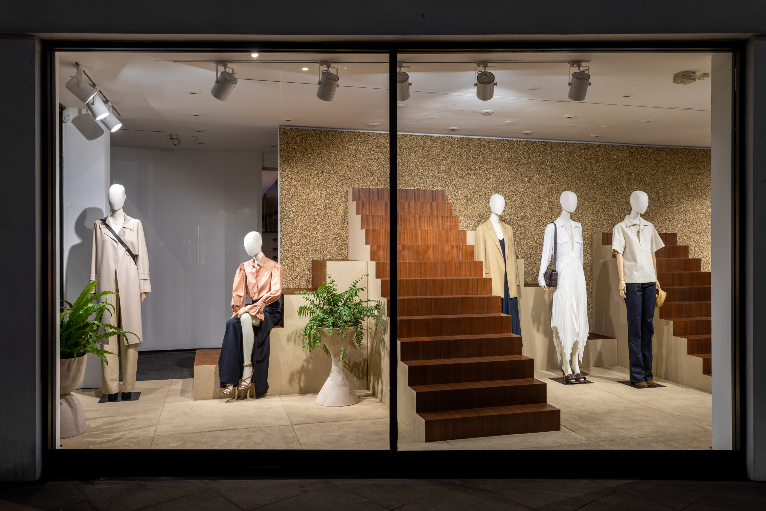 Defined by clean lines and strong geometry, the stepped forms introduced rhythm, symmetry and shadow, forming an abstract yet elegant backdrop for the collection. The interplay of light across the structure enhanced the depth and visual impact, drawing attention from the street.