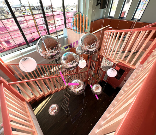 Set amongst gift boxes and disco ball accents, the installation balanced playful brand identity with a high impact visual finish, drawing attention from the street and enhancing the in store experience.