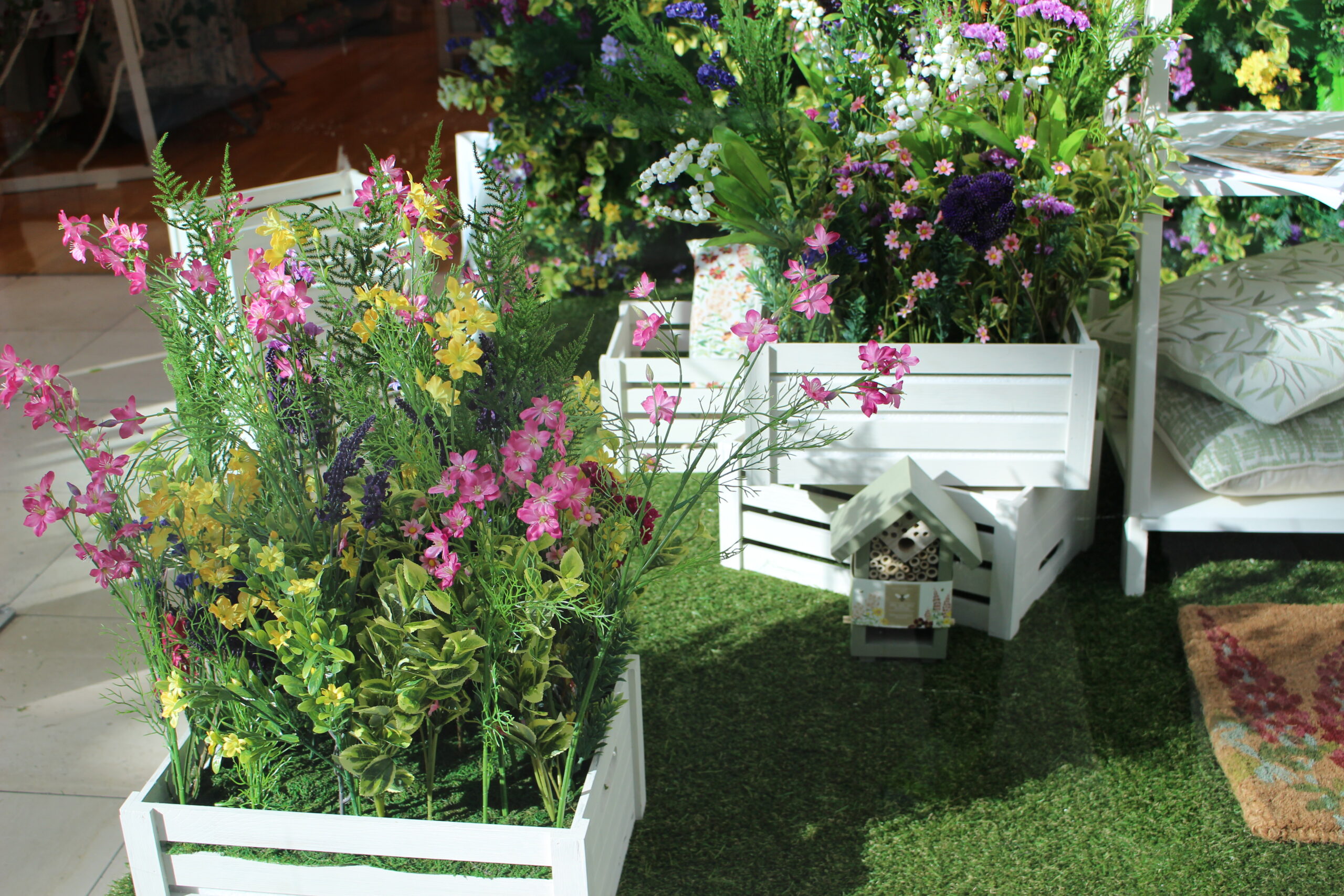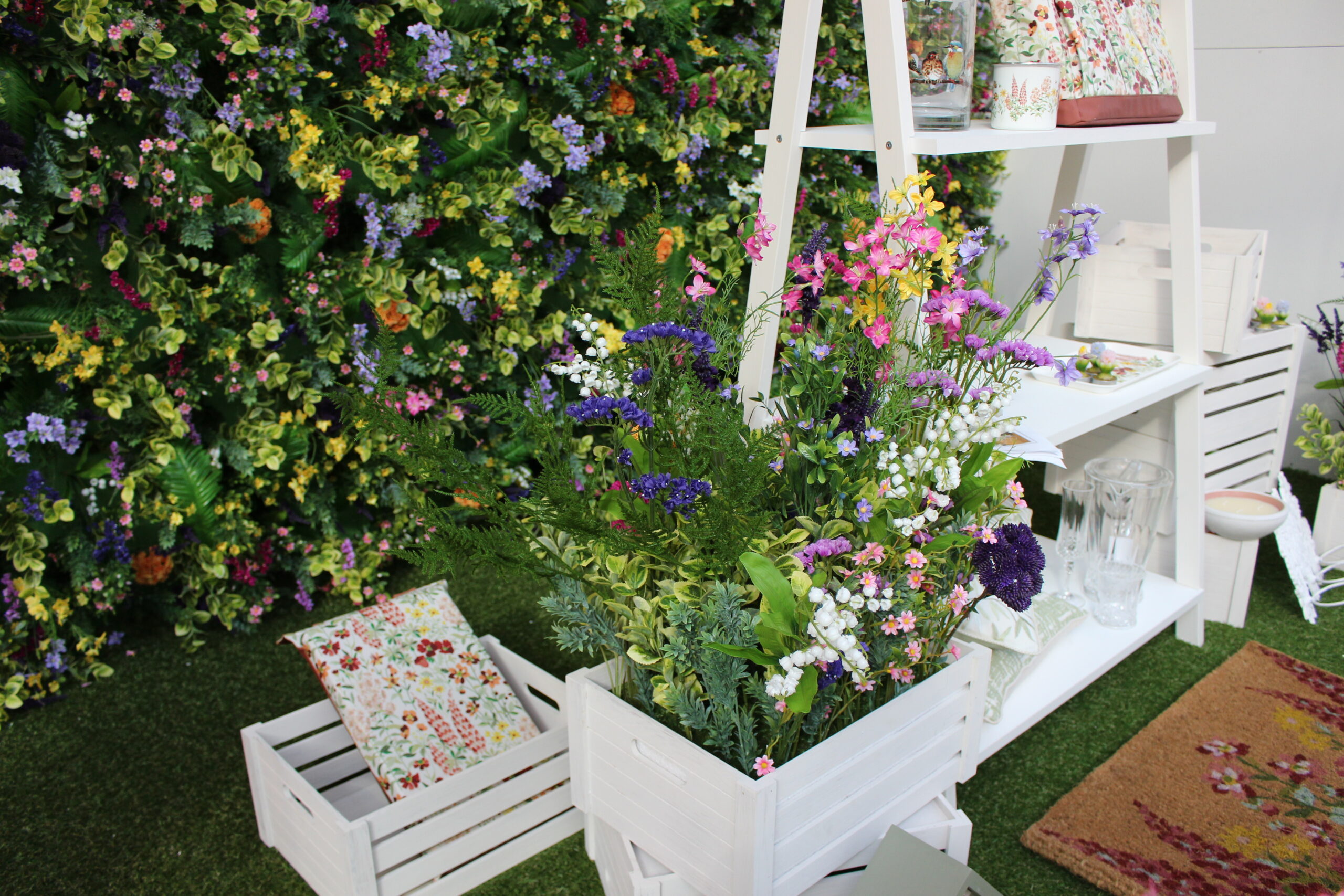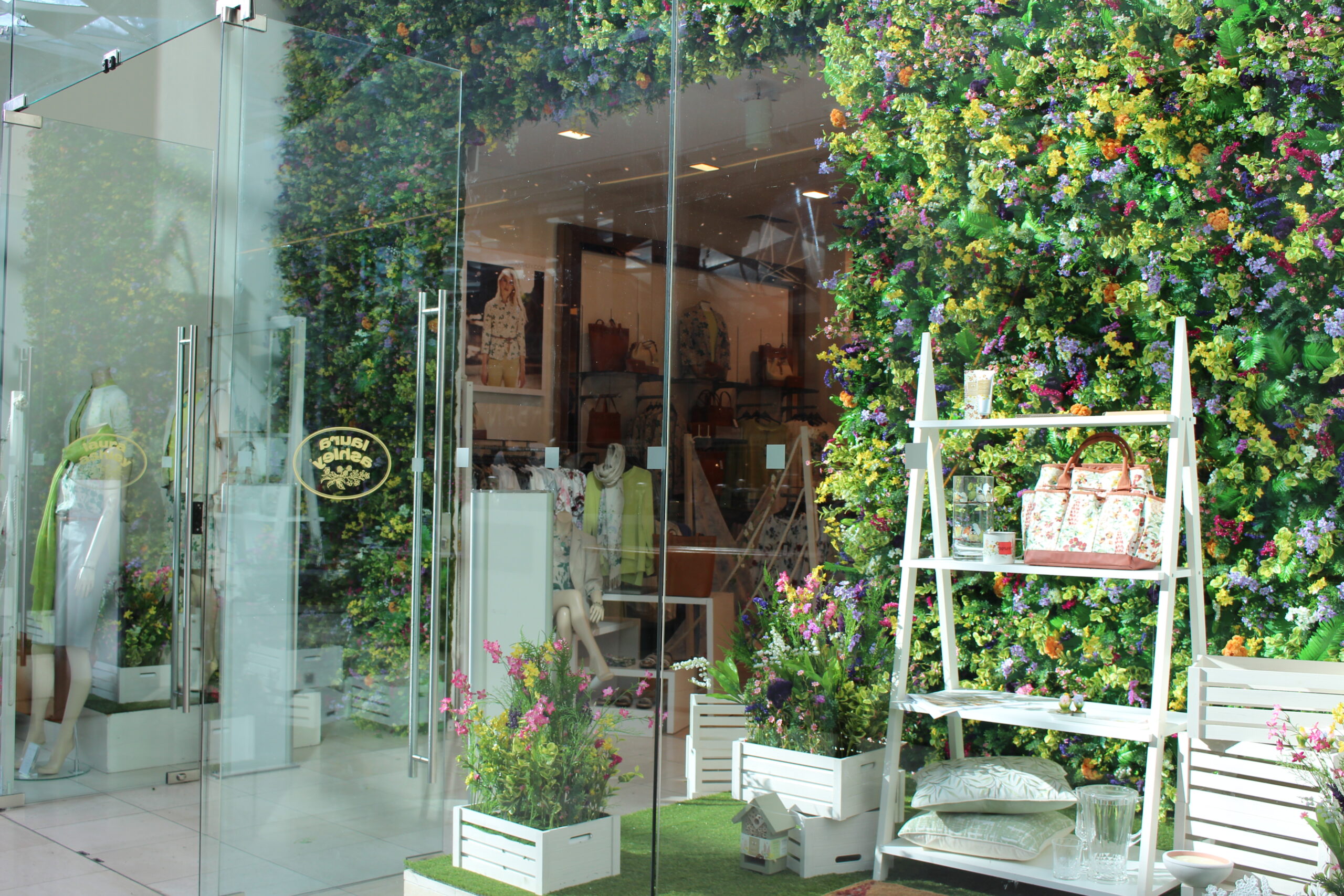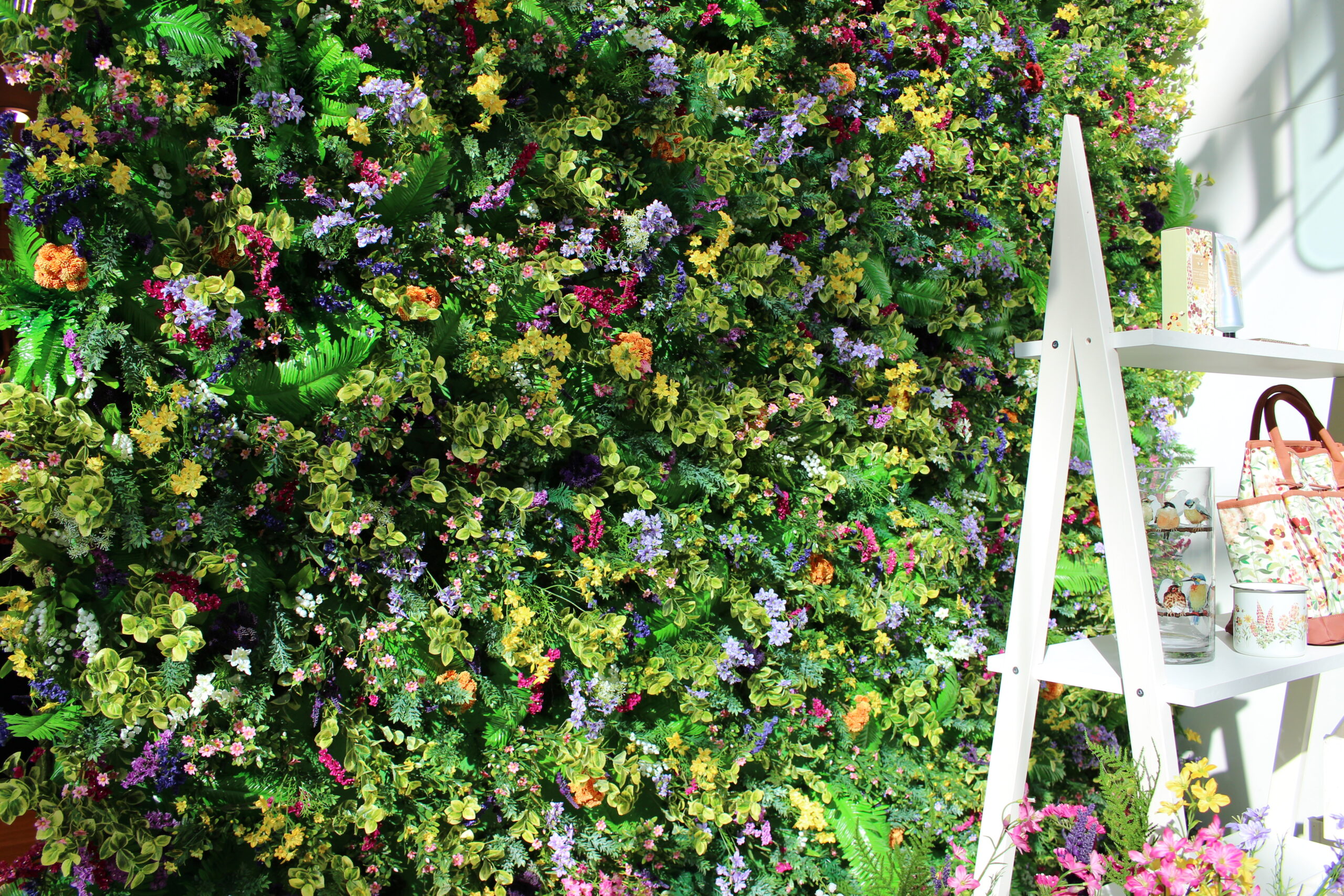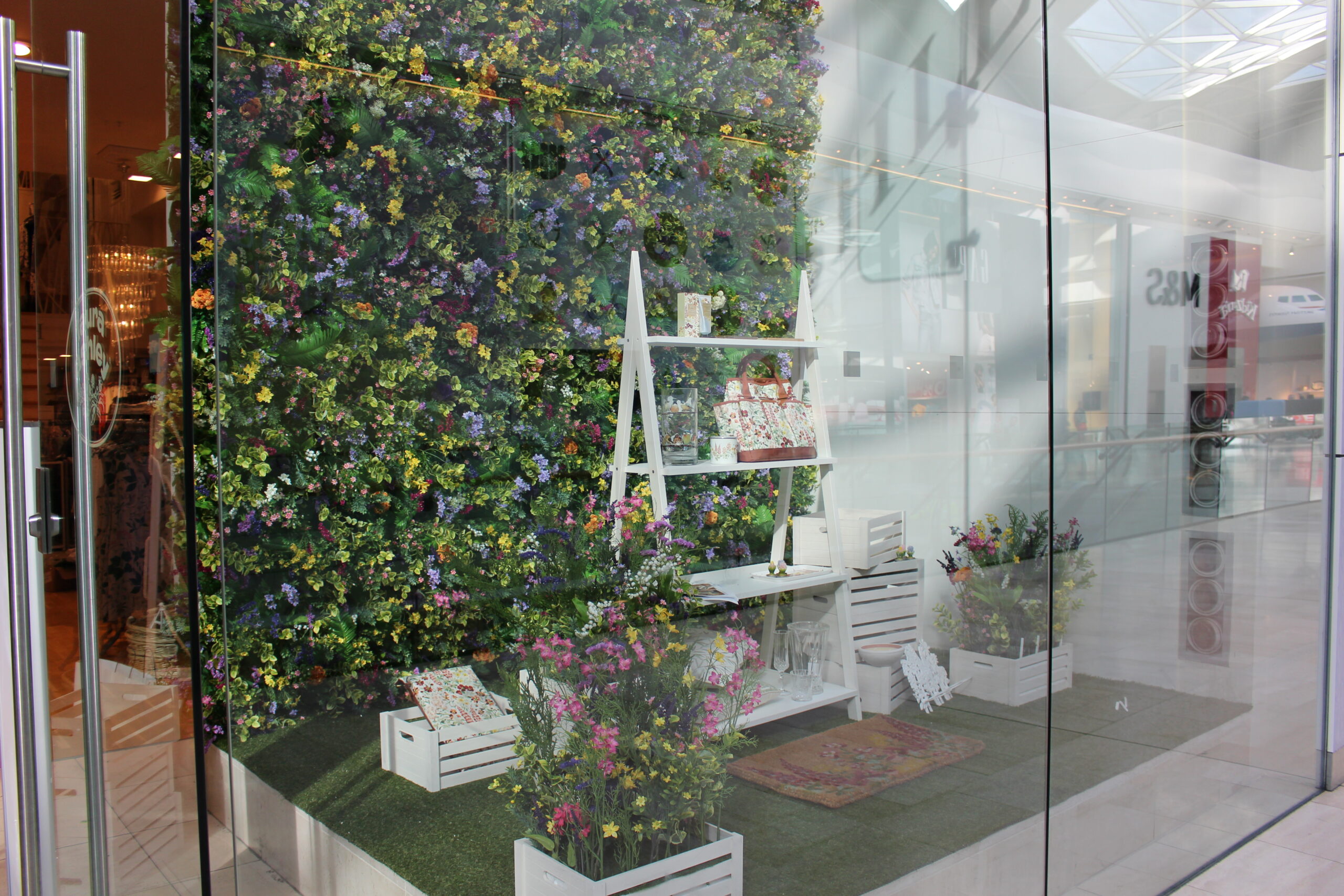 Across all locations, the displays were transformed into wild meadow inspired scenes, layered with planting, florals and soft textures to evoke a natural, seasonal feel. At the Westfield flagship, the concept was elevated further with a large scale feature wall, densely dressed with artificial flowers, foliage and moss to create a striking, immersive backdrop.