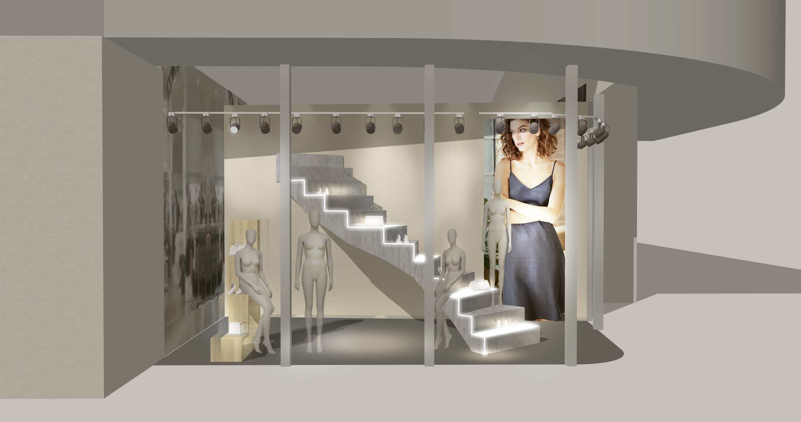 A family of stepped plinths, finished in sprayed, timber and concrete effects, formed the core of the scheme, enhanced with colour-changing LED trims. Bespoke ladder units in solid oak added height and versatility, while a large-scale concrete-effect staircase with illuminated treads created a striking focal point.