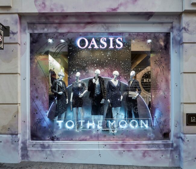 Lush cascading greenery, suspended florals and oversized sculptural bees brought movement and depth to the curved storefront, echoing the scent’s heritage and garden inspiration. At the centre, a bespoke fragrance plinth wrapped in textured foliage and finished with an oversized bow heroed Highgrove Bouquet within the immersive scene.