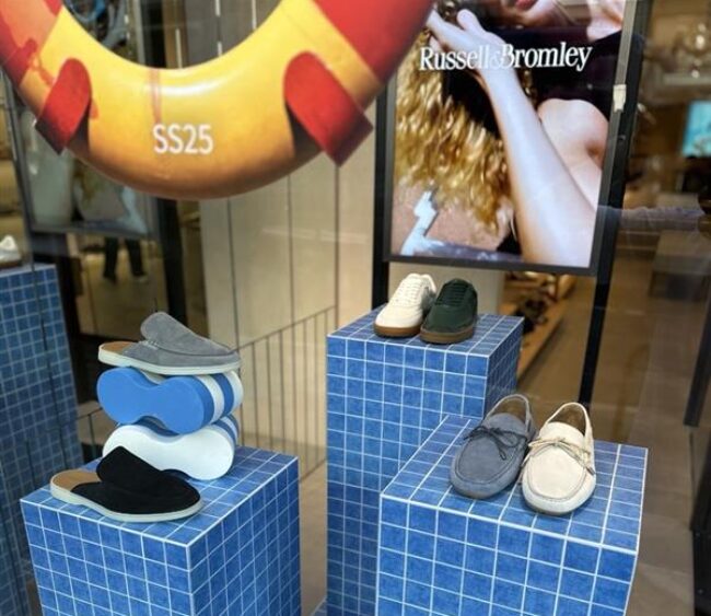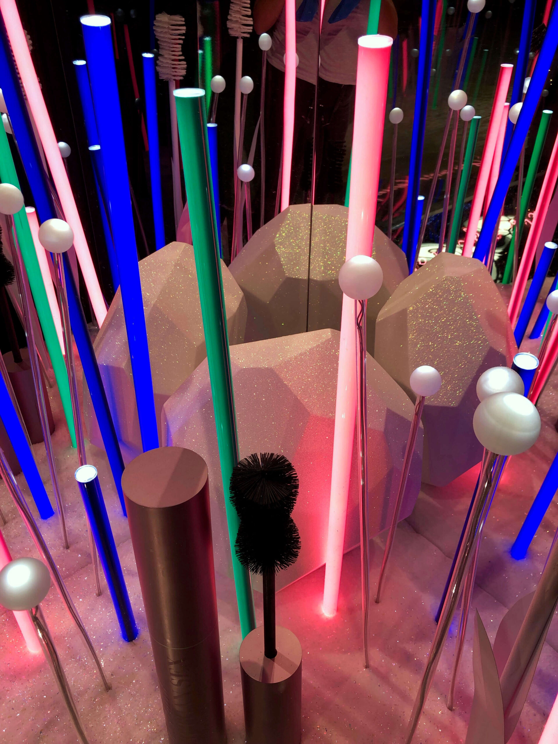 Layering reflective, iridescent and metallic finishes, the space was designed to shift and shimmer from every angle. Mirrored walls and a two-way mirror floor created depth, while a powder pink neon sign added movement and glow.