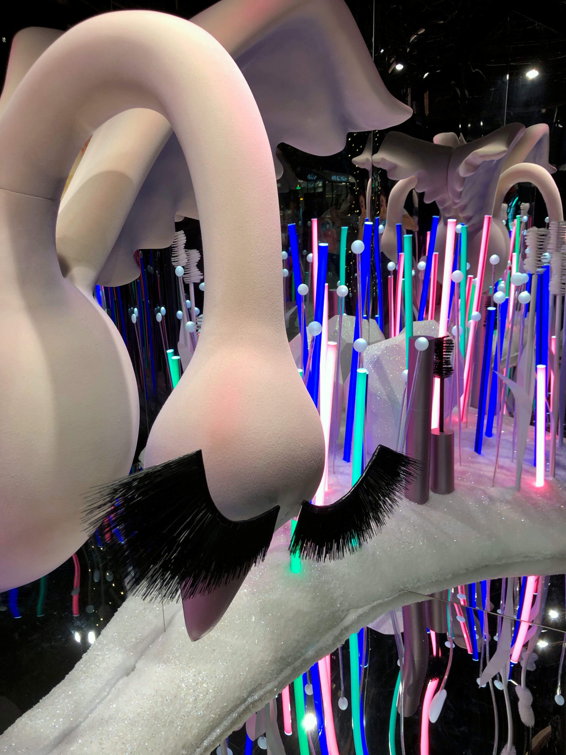 At the centre, a sculptural swan with blush flocking and dramatic lashes introduced a playful focal point, alongside an oversized mascara factice set within glittering snow drifts.