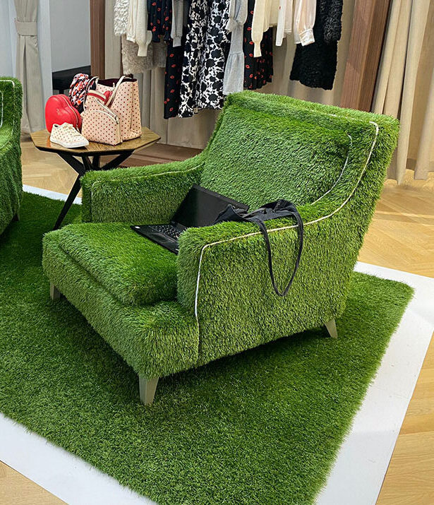Working closely with the creative team, we designed and produced a series of sculptural topiary elements, from hand-built totems to fully clad window façades, creating a bold, immersive backdrop. Inside, seating was reimagined with grass upholstery, tying the space together with a subtle nod to the tennis court.
