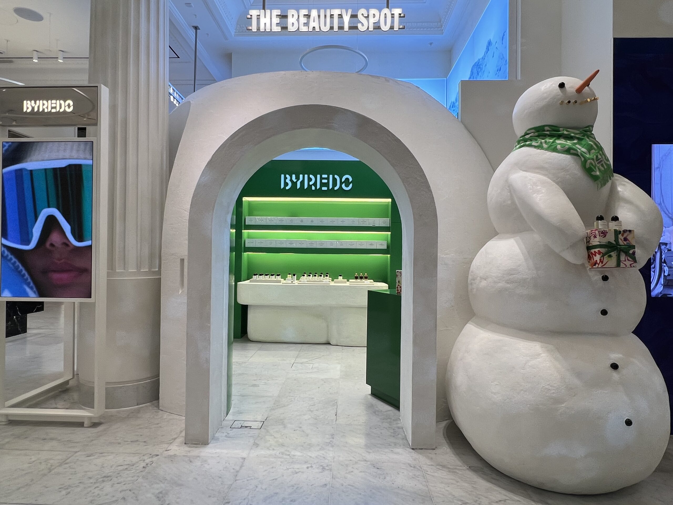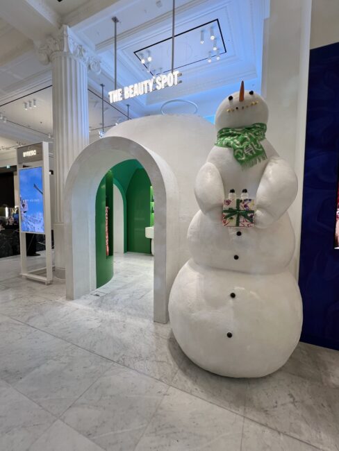 At the heart of the space, an igloo inspired structure created a strong architectural moment, combining soft, snow like textures with a clean, sculptural form. Framed by a three metre hand sculpted snowman, the installation drew customers in with a playful yet elevated take on a winter landscape.