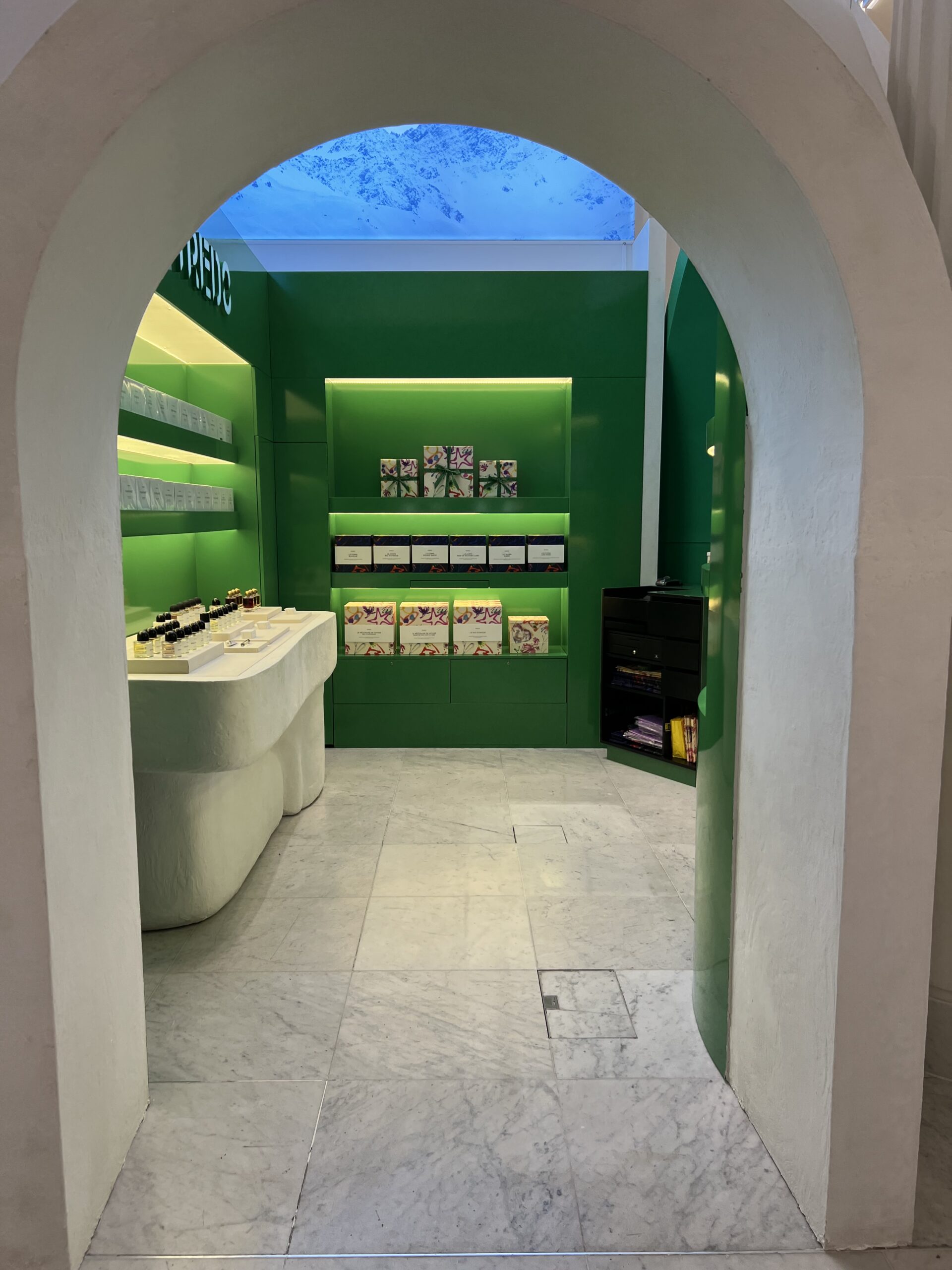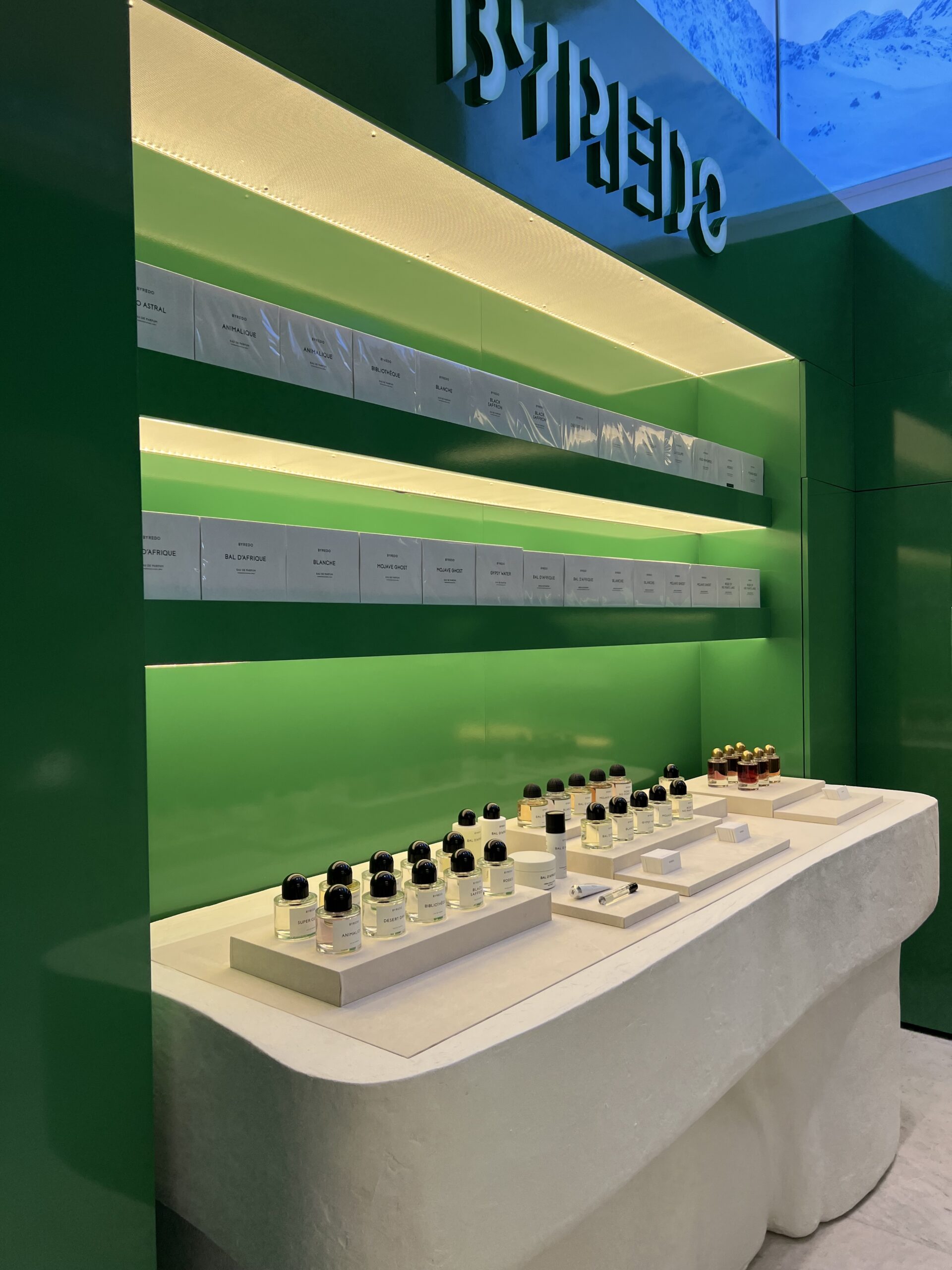 Inside, the environment shifted to a vibrant, high gloss retail space, where the fragrance collection was showcased against rich green finishes and illuminated shelving. The contrast between the soft exterior and polished interior created a dynamic and engaging customer journey.